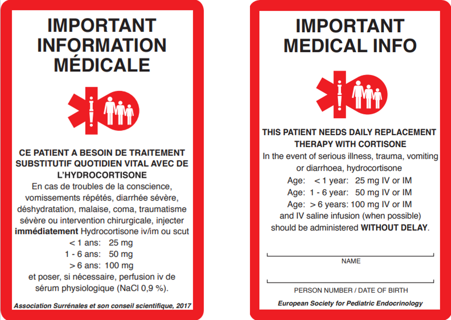 - Hydrocortisone: dès stabilisation du patient passage à dose orale de stress (30-50 mg/m2/jour) i.v. ou p.o. en suivant les conseils de l'équipe local d'endocrinologie pédiatrique.